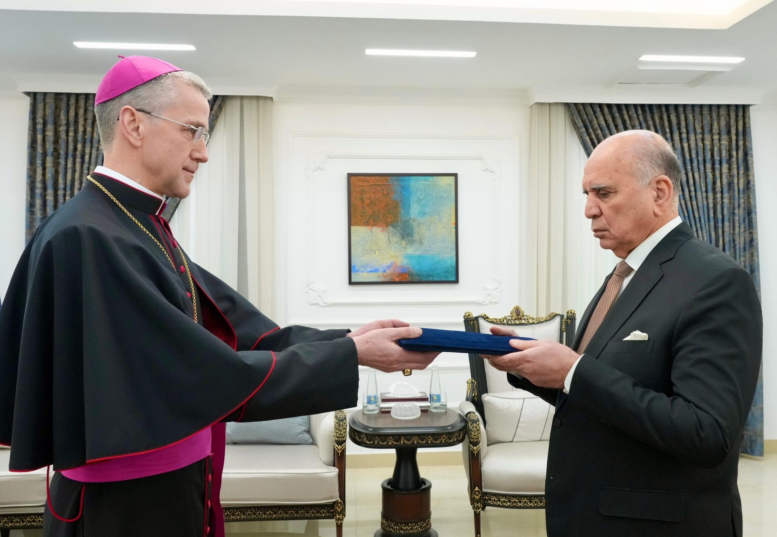 تسلم”نائب رئيس مجلس الوزراء ووزير الخارجية، فؤاد حسين ، اليوم الخميس، في مقر الوزارة ببغداد، أوراق اعتماد سفير دولة الفاتيكان غير المقيم لدى جمهورية العراق، السفير مونسنيور ميروسواف ستانيسواف واخوفيسكي”.