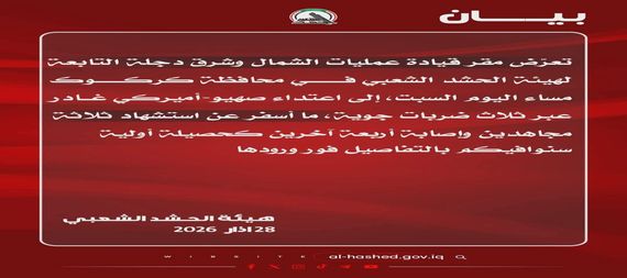 وقالت الهيئة، في بيان اطلعت عليه وكالة الاكاديمية نيوز ( انا ) “تعرض مقر قيادة عمليات الشمال وشرق دجلة التابعة لهيئة الحشد الشعبي في محافظة كركوك، مساء اليوم السبت، إلى اعتداء صهيو-أميركي غادر عبر ثلاث ضربات جوية”.