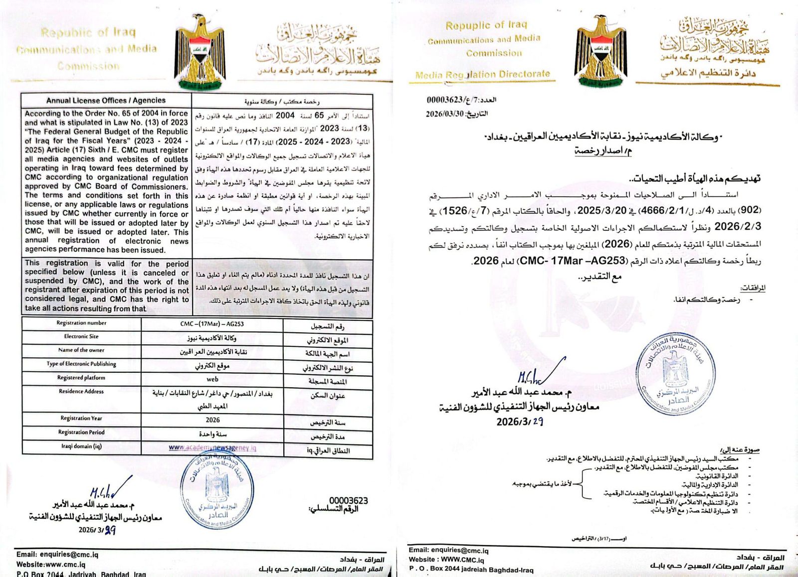 اصدرت هيئة الاعلام والاتصالات رخصة العمل الاعلامي لوكالة الاكاديمية نيوز بالرقم ( CMC-17Mar-AG253 ) لعام 2026 وذلك لاكمال الوكالة الاجراءات الاصولية الخاصة بتسجيل الوكالة وتسديد المستحقات المالية المترتبة على ذلك , أعلن ذلك لمراسل وكالة الاكاديمية نيوز ( انا ) مدير عام الوكالة رئيس التحرير أن هذه الرخصة جاءت بعد ان اكملت الوكالة المتطلبات والشروط اللازمة لتسجيل الوكالات وفقا لشروط وقواعد البث الاعلامي التي وضعتها هيئة الاعلام والاتصالات , معربا عن شكره لمجلس المفوضين في الهيئة والجهاز التنفيذي والعاملين فيها .