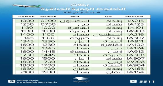 اعلنت شركة الخطوط الجوية العراقية ، جدول رحلاتها ليومي السبت والاحد 18 و 19 نيسان الجاري